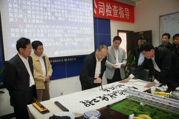 4月15日,中纪委驻交通运输部纪检组长杨利民在驻省交通运输厅纪检组长王晓共、厅监察室、中原高速等有关领导的陪同下,到郑新黄河大桥视察指导工作。杨利民组长深入到工程一线详细察看了郑新黄河大桥工程施工情况,听取了工程进展情况汇报。杨利民组长对中原高速在项目建设中全面推行《标准化工法》、创优质工程、以及党风廉政建设方面所取得的成绩给予了充分的肯定,并题词“创国家优质工程,树河南交通形象”。杨利民组长要求:一是要克服金融危机造成的严峻困难,在困难中锻炼好建设队伍,继续为地方经济保驾护航;二是要结合科学发展观教育活动,切实提高领导班子科学发展的能力和水平,带出一支业务精、素质高、战斗力强,能打硬仗的管理队伍;三是要进一步完善廉政建设监督机制,使廉政教育经常化,继续保持郑新黄河大桥廉政建设“零”违纪;四是要加大科技创新应用,积极构建人与自然和谐工程;五是要积极探索高速公路建设新方法、新思路、新举措、进一步提升河南高速公路文化建设的层次和品质,把河南高速文化建设推向一个新的高度;六是要把郑新黄河大桥建设成为世界一流桥梁工程,确保国家优质工程金奖。