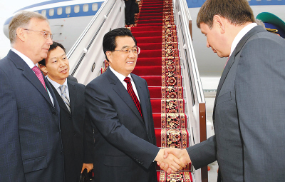 当地时间19时50分,胡锦涛乘坐的专机抵达叶卡捷琳堡科利佐沃机场。胡锦涛在机场受到俄罗斯外交部副部长博罗达夫金等的热情迎接。