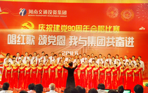 6月15日下午,河南交通投资集团以《唱红歌、颂党恩,我与集团共奋进》为主题的庆祝建党90周年合唱比赛暨先进表彰大会在交通厅三楼会议室召开,共有11个代表队参加了比赛。郑漯分公司合唱团代表河南中原高速公路股份有限公司参加了比赛并荣获金奖。
